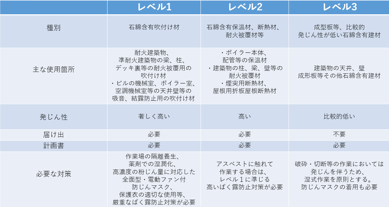 アスベストは、粉じん発生率または飛散率のことを指す、「発じん性」を基準に、3つのレベルに分類されています。